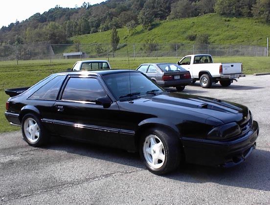 Here's the Saleen wing after delivery on my porch w/ my watchdog, I mean cat. And here's a pic of the car after installation of the wing. It actually wasn't that hard, it just took us about 3 hours. But it was our first experience w/ a Saleen wing on an LX hatch & we had some common rust spots to patch up on the hatch.