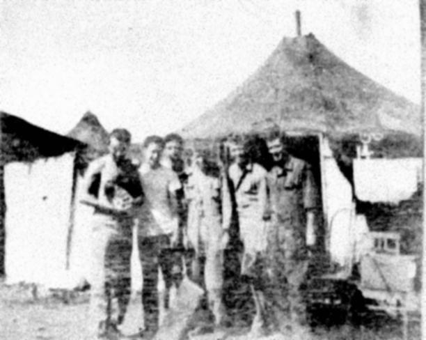 Part of the crew after a ballgame. L-R Bob Boone, Pilot; Vince Gallager, Bill Kelly, John Roe, Bob Schaefer, Howard Sumerlin, co-pilot. Chandler Porter, Jerry Lemieux, and Bill Neutzling were AWOL for this picture. Smoke in background was from a huge explosion at the next field.. |