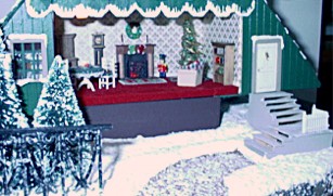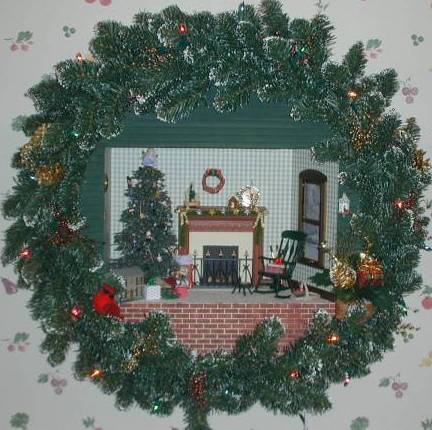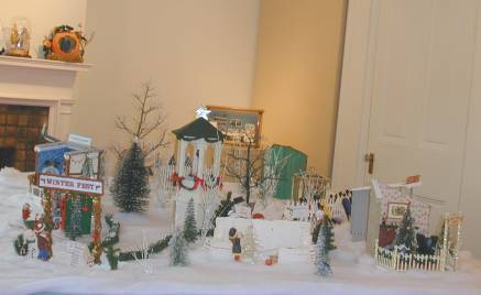 The club I belong to in Gallipolis puts on an exhibit every October for the entire month and, along with whatever each member has made and wants to display, we do one group project. In 2001 it was "A Winter Festival" based on the projects by JoAnn Swanson in three issues of Dollhouse Miniatures magazine. This first picture is of the entire scene.