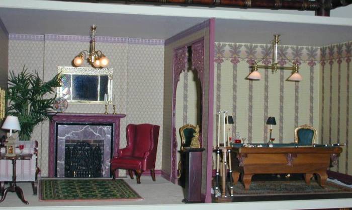 Next are two pictures of the roombox I've made for my oldest daughter who is an avid pool player. I keep telling my daughter I'm not ready to give it to her cause it still needs some finishing touches - pictures on the walls, maybe a coffee table, etc. Actually, I'm just not ready to give it up yet! The pictures are pretty much the same - the second one is just angled a little to show the laser cut room divider I used. The only things I made in this scene are the rug in the sitting room and the fireplace. Most of the other items are either artisan pieces or souvenirs from NAME conventions.
