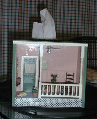 The second project was a Kleenex box cover scene - the kind where you build a box to fit over the cube size tissue boxes and then put a hole in the top for the tissue to come out of. I made mine small enough that I could make it half scale. The rocking chair was made by Ron and April Gill's daughter (I'm sorry I don't know her name). I made the ceiling fan out of a bead, jewelry findings, and an index card! Most of the flowers were from various swaps, the little welcome sign is from a recent issue of Dollhouse Miniatures magazine, the "curtain" in the door window is the liner from a light bulb pack, and the lattice underneath the porch is plastic needlepoint canvas.