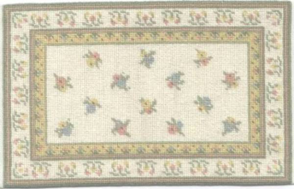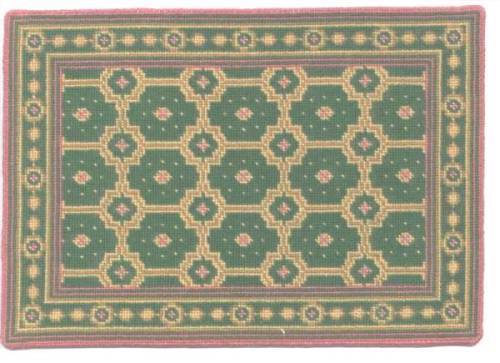 My second new rug is a design by June Grigg, a popular designer of dollhouse miniature patterns. The colors are more softly muted than the picture shows. She designed this rug for a special "sun room" type setting and it would also be lovely in a bedroom. It's size is 4-1/8" x 6-1/2" not including the grosgrain ribbon-style fringe at both ends. It is worked on 24 count Congress cloth with DMC flosses. $125.00.