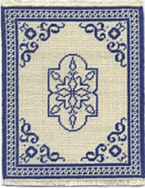 This rug design is from the Dover book "Miniature Needlepoint Rugs" and rather than work it in the three colors suggested, I chose just the blue and cream because I wanted it to have the look of Chinese blue and white porcelain. This rug measures approximately 4-1/2" x 6" on 22 count canvas and has hand knotted fringe. $75.00.