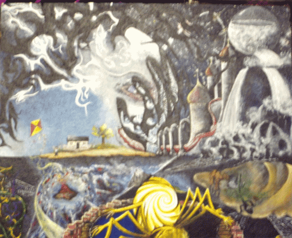 I think the painting as a whole can have many different interpretations and thats why i think most people can relate to the images seen. This is probly my favorite painting i have done so far in my career but since i have attended college i have learned and grown so much that to me this is crap. Its a little fuzzy too sorry ill try and get a better picture one day.