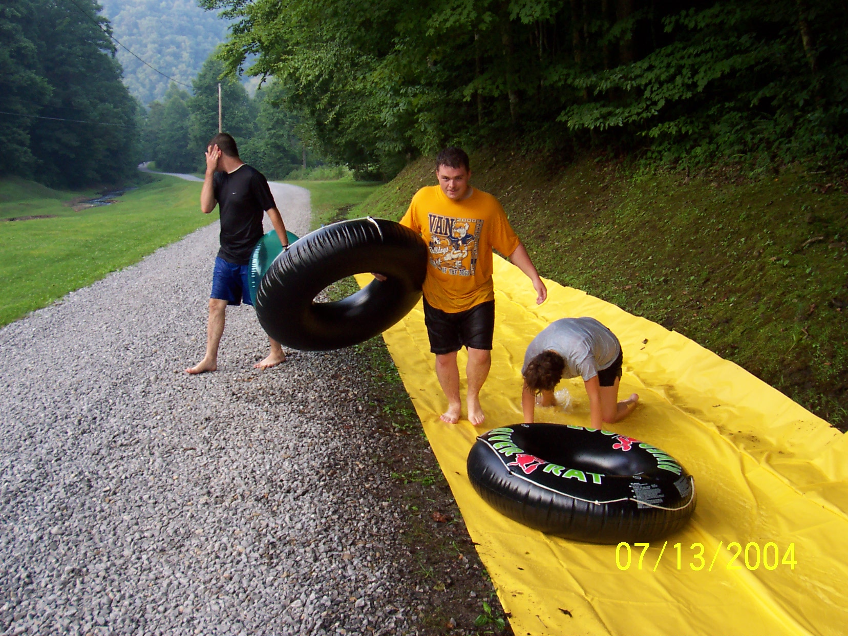 This is for all of you that have been wondering what the wet banana is! Here you will find out everything you need to know about another fine Bandytown social event. Another one of our Bandytown secrets is the community has frequent get-togethers and we do things together very often. The wet banana is a well known traditional Bandytown event that has been going on for years. The wet banana is a large water slide created by taking mining tarp and plastic and placing it on a large hill. Then using water pumped from the creek and mixing in some soap you grab a tube and slide down for the ride of your life. Look below for pictures and be ready to laugh! Now with all of that said what are you waiting for grab your tube and come on!