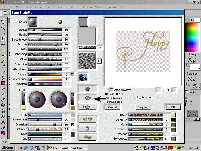 7. Go to effects, Plugin Filters, Flaming Pear, Super Blade Pro and select the gold shiny preset.