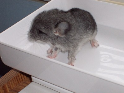 The first litter we had born here, was February 26, 2003. Four standard babies, 3 girls and 1 boy. They were born to my first pair of chins, Fluffy and Chachi (both standards). Sadly, Fluffy developed pneumonia and I think it was because of this that 2 of the babies did not survive. Fluffy was fine though, after some meds, and raised a healthy baby boy and girl.