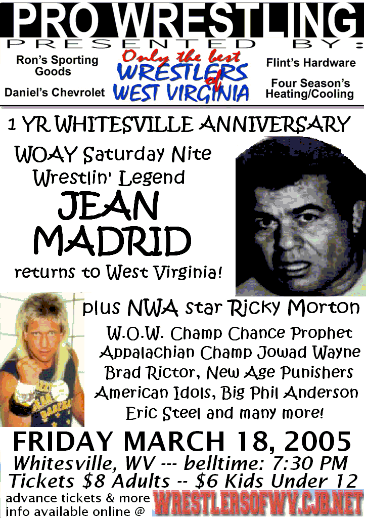 WOAY Saturday Nite Rasslin' Legend Jean Madrid aka Gypsy Joe will be returning to the state of West Virginia on Friday Night March 18 at the W.O.W. Whitesville 1 year anniversary bash! Jean Madrid controlled the WV wrestling scene back in the 70's and he's now making his return to his old stomping grounds and rumor has it the Cuban Assassin is not too happy with this.