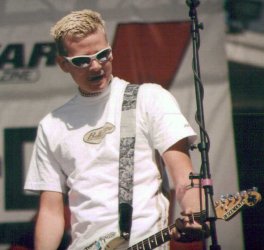Mark plays a Fender Custom Shop Precision bass, split into a Mesa Boogie 400+ amp, powering an Ampeg 810E cabinet, and an Ampeg SVT 3 pro amp, powering another Ampeg 810E cabinet. He uses an X-Wire digital wireless system, and makes a fair number of mistakes. He also uses Ernie Ball Hybrid Slinky bass strings, and Dunlop Tortex .60mm picks. When he isn’t running around naked, he wears Hurley clothes, Puma shoes, and Black Flys sunglasses.