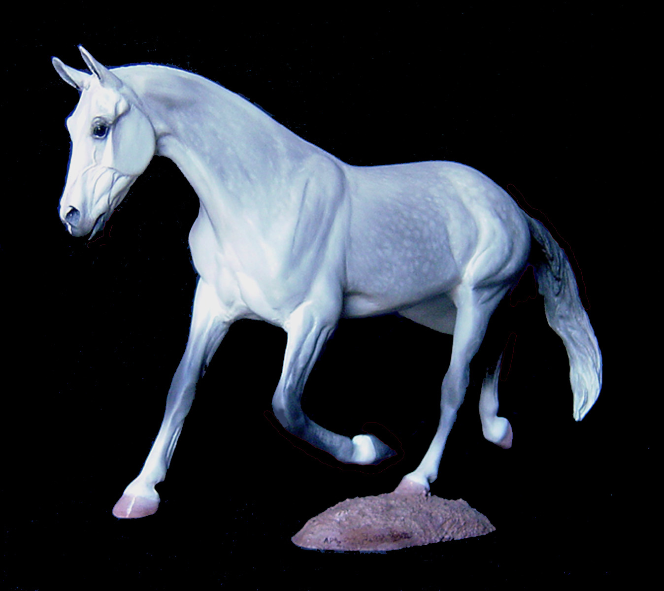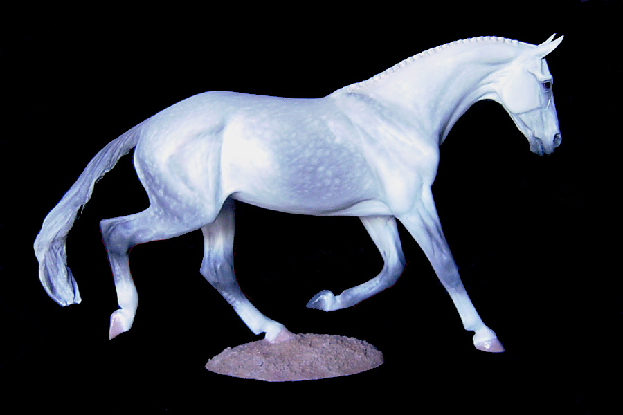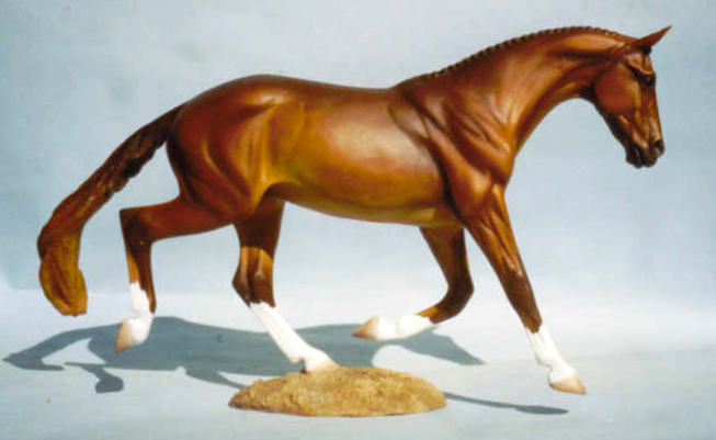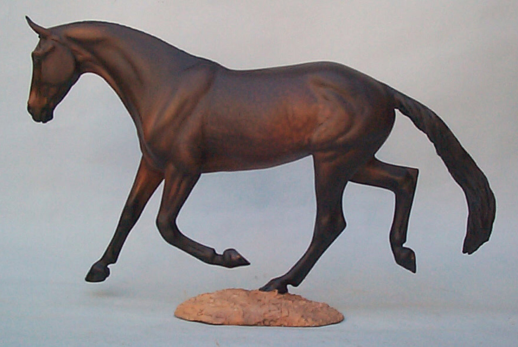 This sculpture depicts a young thoroughbred hunter mare in a flowing trot.