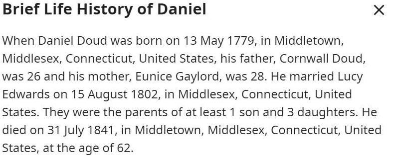 Daniel Doud born 13 May 1779 died 31 July 1841. Buried at the Durham Center Cemetery, Durham, CT. He was a Blacksmith by trade.