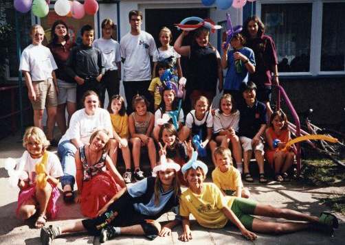 We played lot's of games with the kids. With this game here you sit in a circle, get a big ball of ribbony stuff and throw it across to different people. When you get the ball you say 'Mein name ist Murray' (which is German for 'my name is Murray' If your name isn't Murray, I tink you say sumfing else...) and say your favorite thing. Then you throw the ball to someone else (don't let go of the ribbon!). At the end, you have a webby thing, but I didn't see a big spider...(yeah, okay, I was hiding...) |