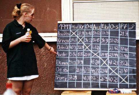 And the results are... well, look for yourself! Show 'em, Vanessa. Australia returned the excellent hospitality of the Czech people by letting them win every game... aren't we nice? Afterwards we found out that the Czech's have World Champions of their own, notably in Ice Hockey, and lots of good tennis players. Anyway, the Aussies had by far the best cheer squad on the day! So there! |