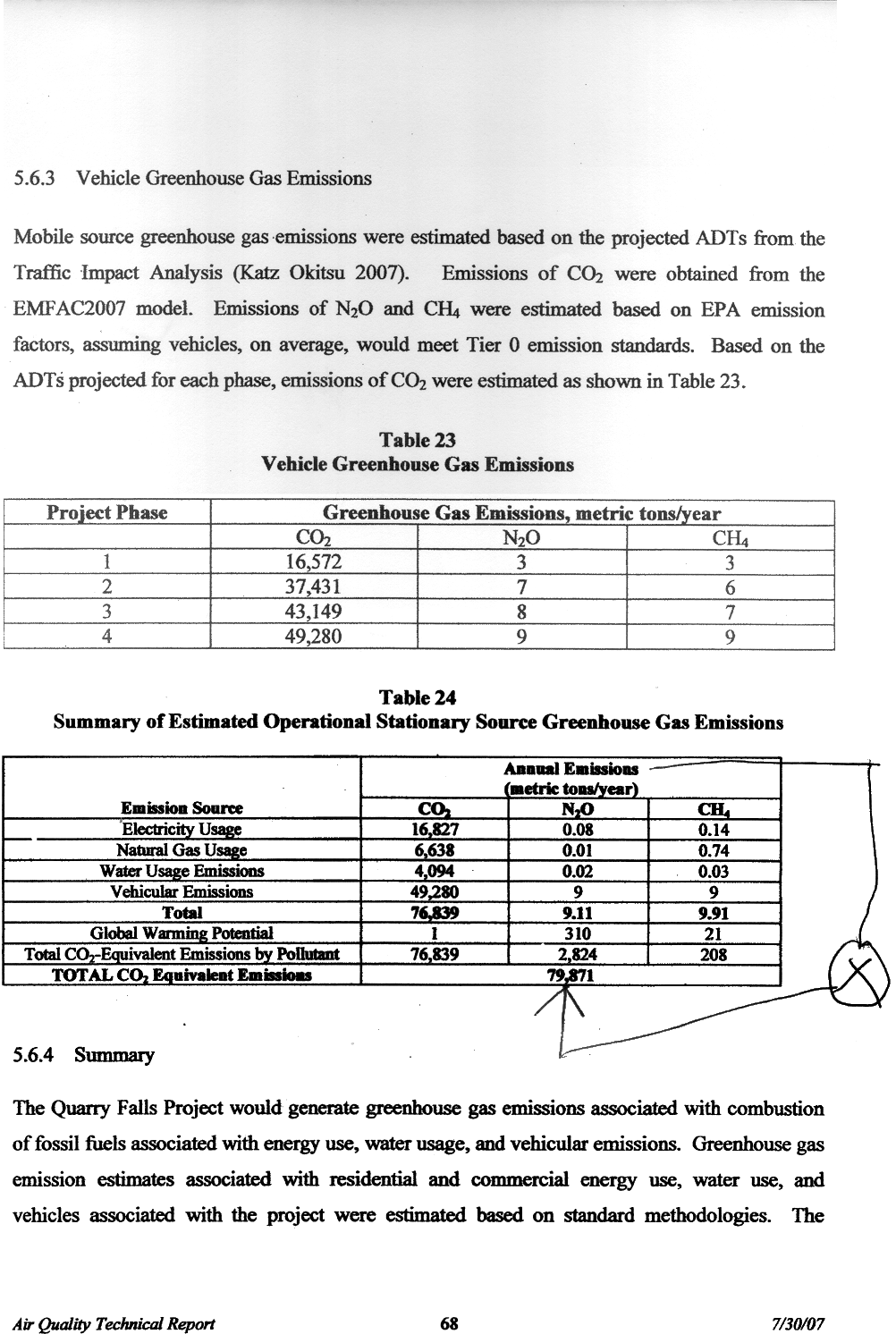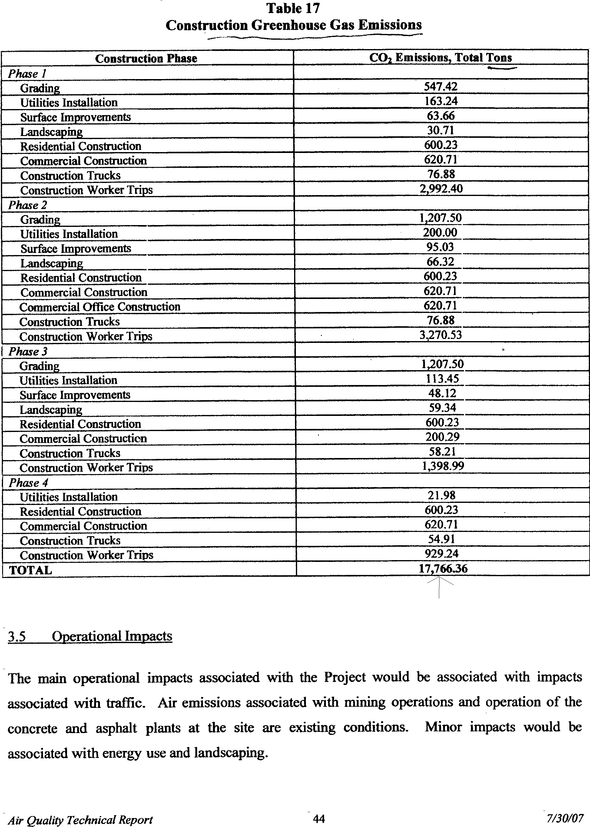 GREENHOUSE GAS EMISSION CHART SHOWING OVER 17,600 TONS OF GREEN HOUSE GASES WOULD OCCUR--AND THAT IS ONLY FOR CONSTRUCTION. THIS CHART WAS ALSO OMITTED FROM THE DEIR/1st CD. IT IS FOUND ONLY ON THE 2nd CD NOT GENERALLY DISTRIBUTED TO PUBLIC! YOU THINK THAT IS BAD? ACCORDING TO THE AIR QUALITY TECHNICAL REPORT (AGAIN, ONLY ON THE 2ND CD NOT DISTRIBUTED TO GENERAL PUBLIC), 79,871 METRIC TONS/YEAR OF GREENHOUSE GASES WOULD BE GENERATED BY PROJECT (TABLE 24; P. 68 OF APPENDIX C). THIS IS EQUIVALENT TO 88,000+ TONS/YEAR OR OVER 241 TONS/DAY OF GREENHOUSE GAS EMISSIONS. YET THROUGH REMARKABLE VERBAL GYMNASTICS, THIS IS NOT CONSIDERED "SIGNIFICANT"! (..."project consistent with CA Assembly Bill 32..."