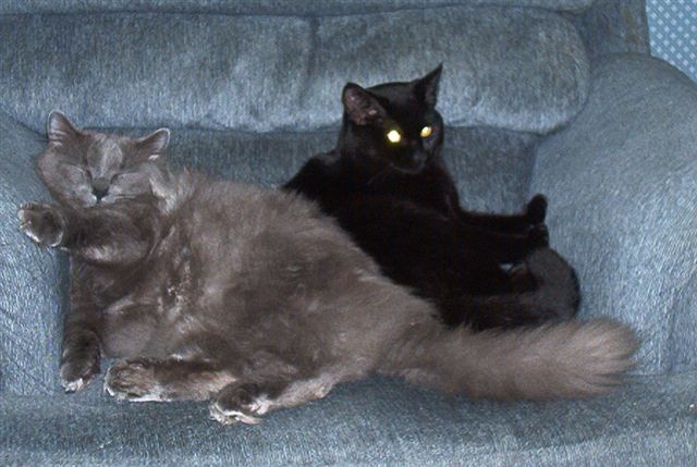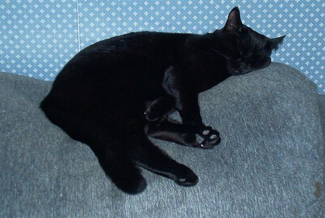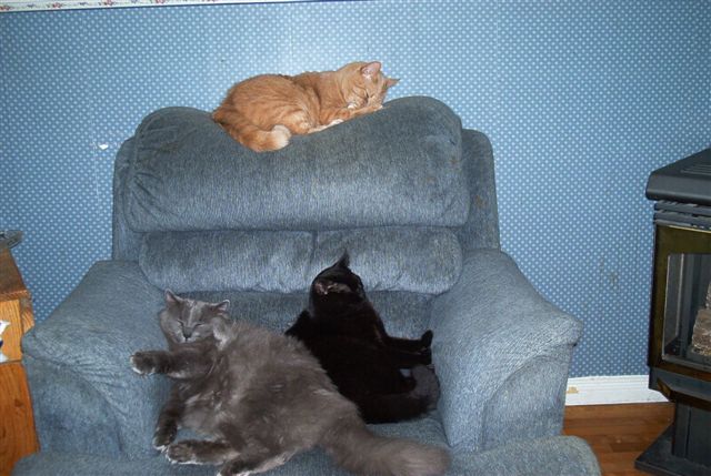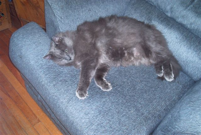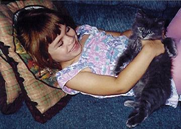 I don't know who wanted a kitten more, Brittany, or Daddy, but eventually I gave in! They really had to twist my arm you know...LOL! Well, he was worth it. A tiny grey bundle of fluff. I was afraid his older roommates might pick on him. I was wrong...HE picked on them! Hissed everytime they came near, and sent them running. Big ol' chickens. Eventually, everything settled down...a couple days into his new home, he remembered how to purr, and we were totally in love. If that's what you call waking me up 6 times a night just to lick my nose...hee hee. He has more character than any cat I've known..what a sweetie!