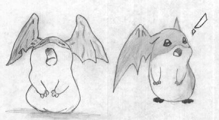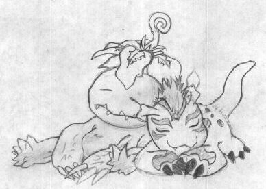 My Name: One hundred yen to anyone who can guess! My Nicknames: Tora, (gee...this is going to be fun....-_-*) Squirt, Munchkin, Short Stuff, Walking Dictionary, Talking Encyclopedia, Samurai, Hamster, Yolei, That Person, Insanity Reincarnate, Shuckle, Youthful One, Squad of Mad Scientists reject... My Siblings: I was adopted, I tell you! My Life: None. My School: Purgatory Current state of mind: I lost it. Favorite Anime: ...Anything CLAMP! Digimon!! Ranma! Sorcerer Hunters! Inu-Yasha! Slayers!! Favorite Anime Character: It depends on my mood... Favorite color(s): Anything but pink. Where I Live: That little speck of ink on a sheet of computer paper... My pets: 6 dogs, 1 parakeet, 2 cats, 2 horses, and Ucchan! ^_^! Favorite Book(s): The Dark is Rising, The trilogy His Dark Materials, Splinter of the Mind's Eye, the life of Ken Ichijoji....::much drooling:: Favorite Telephone: One that picks itself up! Computer: A cardboard box and some duct tape. It's name is slow. Say 'hi', Slow! Favorite Pastime(s): Reading, ranting Digimon, reading, sleeping, drawing, listening to those voices in my head, browsing through the electronics in the mall...and...other...very important.....things. Favorite food: Cheesecake!!!!!!!!!!!!!!!!!!!!!!!!!!!!!!!!!!!!!!!!!!!!!!!!!!! And THEN some!!!!!! My Fav. Bishounen: How could you make me choose between Yama, Kamui and Dark...? ;_; Fav. Digimon: Poromon!!!!!!!! maybe Patamon...or LadyDevimon...? My Fan Stuff: Fan Fiction: Insanity @ 1 AM: This one I wrote W/ my brother Ucchan, it is about what happens when two authors @ 1 AM have TOO MUCH CAFFEINE! Enjoy! I think...o.o; Mass confusion and plot holes...wait...there ISN'T a plot...u.u;; MY FAN ART: Patas!: It's TK's adorable batpig. In one pose he is crying while the other he has been caught off guard. But isn't he just so cute.....? ::hugs a pata plushie:: Tanemon: What else can I say. It's Mimi's Digimon. Why not draw her, besides she is cute when she is Tanemon and bounding towards Mimi. GomaPals: Gomamon and Palmon decided that they were tired and they were going to take a nap. Of course, that wouldn't have anything to do with the strange fumes that drifted from a small Digiplant, often known to give...pleasant sensations...to those who stood near it. Those same Digimon had always been said to say odd things about many colors and were known to be infatuated (or addicted) to the plant ever afterwards. The morale of this drawing: stay at home, kiddos, and watch TV and play video games and surf the net, looking at the website of a thrice-delirious person who has ALSO inhaled too much today...::meaningful look at her dear eldest sibling:: >^.^< ::whistles innocently and stalks off the screen::