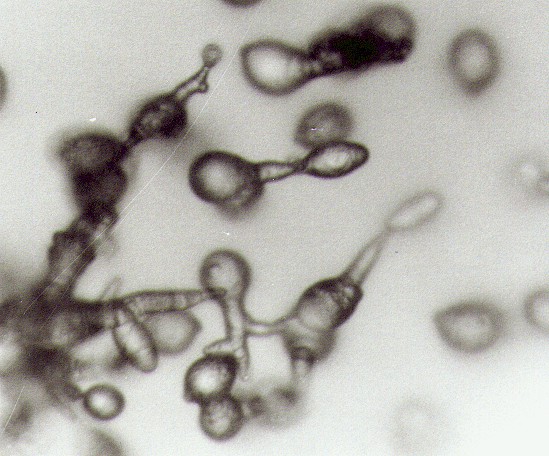 On the top of teliospores one or several light protrusions occurred and soon extended to promycelia (fig. 1). Mature mycelia were hyaline containing yellow droplets, growing in mesophyll of spruce needles.