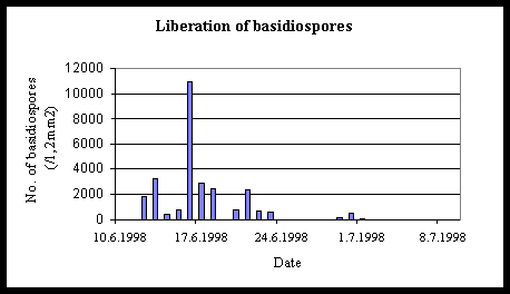 The basidiospore production pink was in the middle of June 1998 (fig. 6). The observation during 1999 and 2000 supposed that. In 2000 the basidiospores begin to occur in the beginning of June. Relative humidity was in long period with 90% in 1998 to compare to 1999. New infection takes place immediately after liberation of basidiospores in optimal conditions.