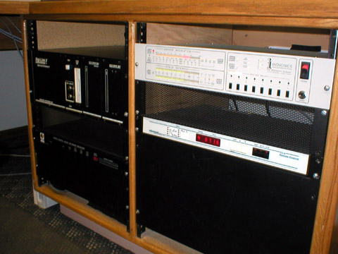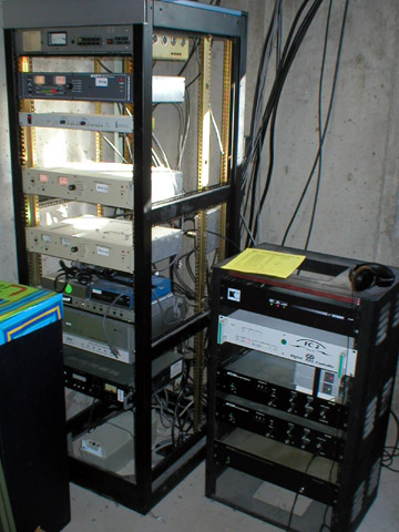 Starting once again to the left we have the Digilink computer (II) and below it is the StarGuide system which keeps the regular programming (the AC network) running as well as CBS news. There are other switchers for other things we will see later. On the right side of the rack starting at the top is where the EAS Receiver should be (it was broken when this pic. was taken) followed by the Air Monitor which controls the power at the antenna and modulation. Below that is our weather radio(which u can't see).