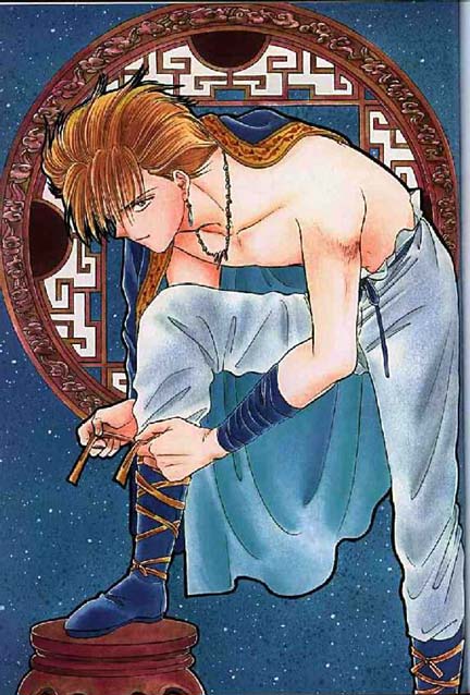 Fushigi Yuugi is a most confusing anime. I can't explain it so Ill just show you how Tasuki came in. But I will tell you Fushigi Yuugi is a bit like the movie "The Neverending Story". It is like that movie because two girls are sucked into a story book basically and are trying to get out but they have become enemies and...GOD THATS CONFUSING!!!So heres a little bit about Tasuki. Tasuki is the 5th seishi. Miaka, Hotohori and Nuriko all go looking for the other seshi, leavind Chichiri to look after Hotohori's country. Tamahome is held prisiner at the palace in Kutou. They travel to the mountain that is full of bandits. And of course are captured. Eiken the fat ugly leader, take Miaka to his room, while Hotohori and Nuriko are taken to be food slave. But everyone thinks that their girls, and Hotohori plays along perfectly, much to Nuriko's suprise. For those that dont know, Nuriko is gay and acts like a girl to remember is sister who died. Nuriko has a crush on Hotohori. They finally get fed up with all this acting so Nuriko takes care of the Bandits. And they both run in to get Miaka. But before any one can get at her, she disapears, and appears in the grasp of Genrou, the real leader who was asbent for awhile.Genrou challanges Eiken for the boss's seat and the prize is Miaka, who he thinks is Eikens wife. And then he runs leaving some wolves to battle with Eiken, Hotohori and Nuriko. Tasuki doesnt really like girls because he grew up with many older sisters, but hes not gay, thank God! His fan posses the power to spout fire.