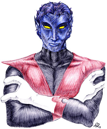 Sometimes at work, it takes a while to get what you're woking on to print. Sometimes, I doodle on the back of old memos and such. This started out as a sketch done with a blue ball point pen. I liked how it was going, and so I took it home and finished it. In keeping with how it started, I used only a black, a blue, and a red ball point pen to finish it, and a yellow highlighter for the eyes. |