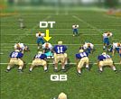 | Figure 2 Illustrates the 4-4 Cheat Strong vs. "I" Option Right. The DT is under player control, ready to stuff the possible hand-off to FB. The line has shifted strong side. Controlling the DT, I recommend moving laterally at the line mirroring any back with the ball. |