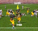 Figure 2 The ball is snapped and both backs are moving left, with the half back soon to cut right. The FB lures a LB(s) in the opposite direction of the play. The WR is released at the hole, already assisting in the opening. Keep you eye on the SS watching for a possible blitz. NOTE: Sometimes when the WR in motion is too close to the QB on the hand-off, the QB will keep it, "tuck it under and go". |