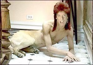 You first see him getting up from a bed, he goes down the corridor and finds one of his doubles; Ziggy, who looks at him like "what??", he closes the door, go dowstairs meeting the poirot sitting on the steps, he goes to the kitchen finds two other doubles looking at him, he opens the fridge but notices that all of his doubles drank nearly all the vittel bottles, he takes a bottle to go out and puts it in his long coat, this is when he sees himself as a Diamond dog laying on the floor and yapping, he goes out with the voice saying Vittel blablabla... He goes with a finger on his mouth saying Shhhhh. And walks on the street smiling!!
