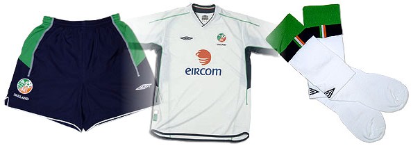 Its been a while in the making, but here it is, The Republic of Irelands new away strip. It will be worn by our boys in the Finals of the World Cup in Korea. Not that different to our current away strip, it displays a v-neck rather than our current round neck style.