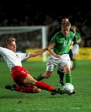 The Republic of Ireland boosted their World Cup hopes tonight dominating the Danes to a 3-0 victory in Dublin. In front of a packed house with star performances from Clinton Morrison on his full 90 minute debut, he capped it off with his second goal for the Republic at senior level. The Danes changed from 2 to 3 up front for the second half, but that didnt rouse too many scoring chances. Then Keane (Rob) struck a 30 yarder right into the back of the Danish goalkeepers net. Sorensen tapped away a shot from Kinsella, and two more from Morrison before Harte struck in the top corner of the net. As Johnny Aldrige,Aldo , who was presenting for Sky said at half time, "My only complaint is that we hav'nt put more in the back of the net".