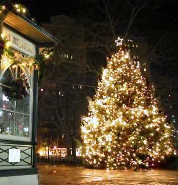 PLEASE CLICK FOR MUSIC Rittenhouse Square Rittenhouse Square is one of the five original squares layed out by William Penn for his "green country town" design for Philadelphia. Today it is a fashionable area to live,dine and shop. During the holiday season , the square turns into a vast glittering display of ornamental lights . On the north west corner of the park is the Church of the Holy Trinity. It was here where the beloved Christmas carol, "O little town of Bethleham was written and first heard. Phillips Brooks was an Episcopal priest from Philadelphia when he journeyed to the Holy Land in 1865. On Christmas Eve, while riding on horseback from Jerusalem to Bethlehem, he stopped at the Field of the Shepherds and watched as dusk enveloped the streets of the village. He then attended the five-hour service at the Church of the Nativity. For three years he kept these memories to himself, then he was moved to relate them to others as he prepared for the Christmas service in his parish. He gave a five stanza poem to the church organist, Lewis Redner, who provided the melody. It was first heard on December 27, 1868 and first appeared in the Episcopal hymnal in 1892 and has gone on to become one of America's favorite carols..