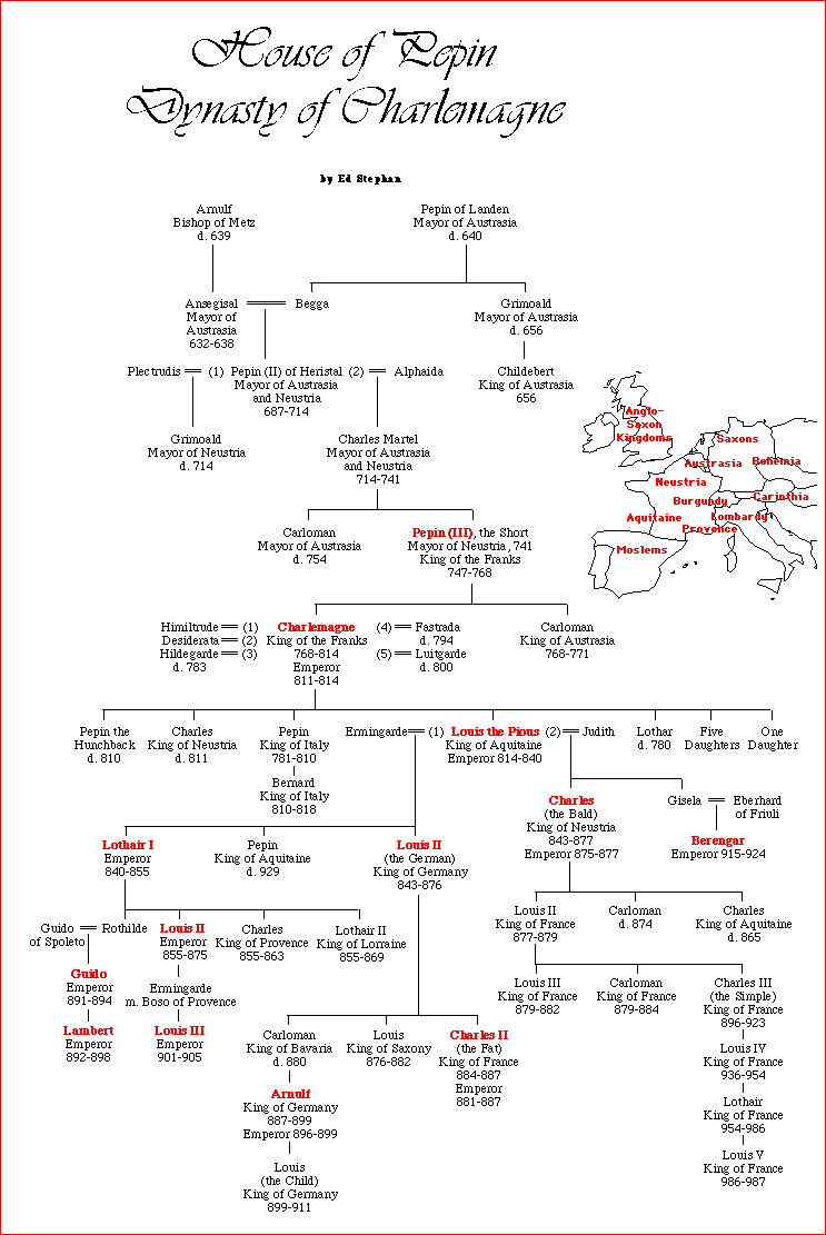 "Charlemagne or Karl der Grosse (as he is known in Germany) became King of the Franks on the death of his father Pepin III in 768. He went on to conquer parts of Italy and Germany, and also fought campaigns in Spain and Hungary. Although the classical Roman Empire had collapsed four hundred years earlier, Charlemagne revived the title of Roman Emperor and was crowned by the Pope in 800. As Roman Emperor and King of the Franks (i.e. France) his attributed arms combined the arms of the old Roman Empire (as attributed to Julius Caesar) and the arms of the Kingdom of France."