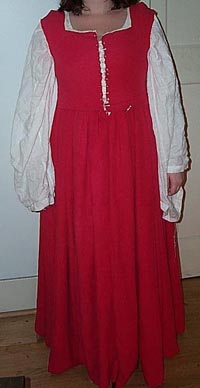 January 29, 2004 - I got the wool side of the bodice attached, the front of the skirt sewn and the straps sewn in time to wear the dress to Ursalmas. I forgot to have anyone take a pic of me, but the fit is much better now. Unfortunately the dress is just a tad heavier than I wanted it and was kinda awkward to wear. So I've gone back to the drawing board about the skirt. I'm going to rip it off the bodice and turn it into a type of circle skirt using a variation of one of Alcega's patterns. I will post more once I know it will work.