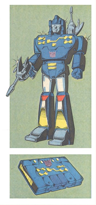 Profile: Rumble is your basic street punk. He compensates for his small size by always acting tough. And he is tough. Cross him and he'll punch your optic sensors out. He has a quick temper and a mean disposition. The other Decepticons try to keep their distance. Yet, this unpleasant, swaggering little hoodlum is one of Megatron's favorites. Rumble follows orders blindly and hungrily; he always waits impatiently for Megatron's next assignment. A good time for Rumble is shaking a building into a heap of rubble. "I love the sight of crumbling bricks," he says.