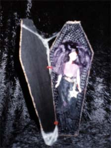 A goth Barby in her coffin, as made by the lovely Andy, the lovely Damita, and the lovely Debbie.