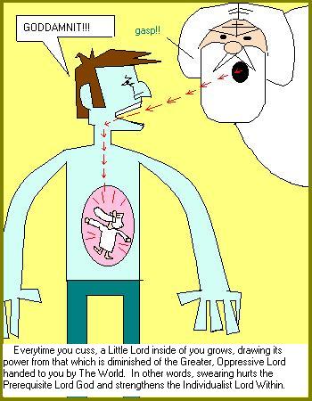 According to the Temple of the Latest People, there is a Little Lord inside of all of us. Religious zealotry runs amok when this little Lord perishes for lack of nourishment. In order to keep our Little Lords going, we need to extract power from the Greater, more Oppressive Lord established by the numerous Tyrannical Religions of the past. This Lord God goes by many names: Jesus Christ, G-d, Allah, Buddha, Aslan. Six is one-half dozen of the other, if you ask us, but that Little Lord inside of you is something that's unique and fragile. According to Fred Rogers, there is no one else like you in the entire world. Now, why would you want to go and spoil that by being consumed by someone or something else? Let your little Lord shine. You can do this easily by cursing. When you use the Lord's name in vein, or say something he wouldn't approve of, like "ShitFuck!", you're defiantly extracting power from his bloated, heavenly mass, and making a discreet contribution to the health of the spirit inside of yourself.
