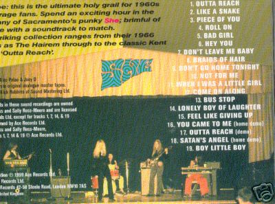 SHE were a really GREAT female rock band from california who played in the late 60s and left behind a great batch of music now available on cd, see page 2 for reviews.......