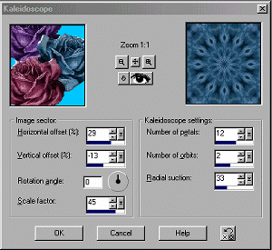 Next go to "Effects", Reflection Effects", "Kalaidescope". This is where you can play around with the settings. I used these settings, but you'll want to try your own later. (Horizontel Offset: 29, Vertical Offset: -13, Rotation Angle: 0, Scale factor: 45, Number of Petals: 12, Number of Orbits: 2, Radial Suction: 33.)