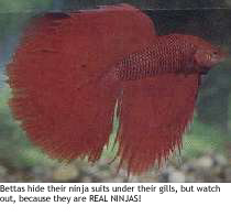 Bettas: The badass underwater ninjas.Betas are the fish versions of ninjas. Bettas are those bluish purple fish, and they wear ninja suits that flare out when they flip out. If you don't know about bettas, you should pull your head out of your butt hole, because they are REAL NINJAS.